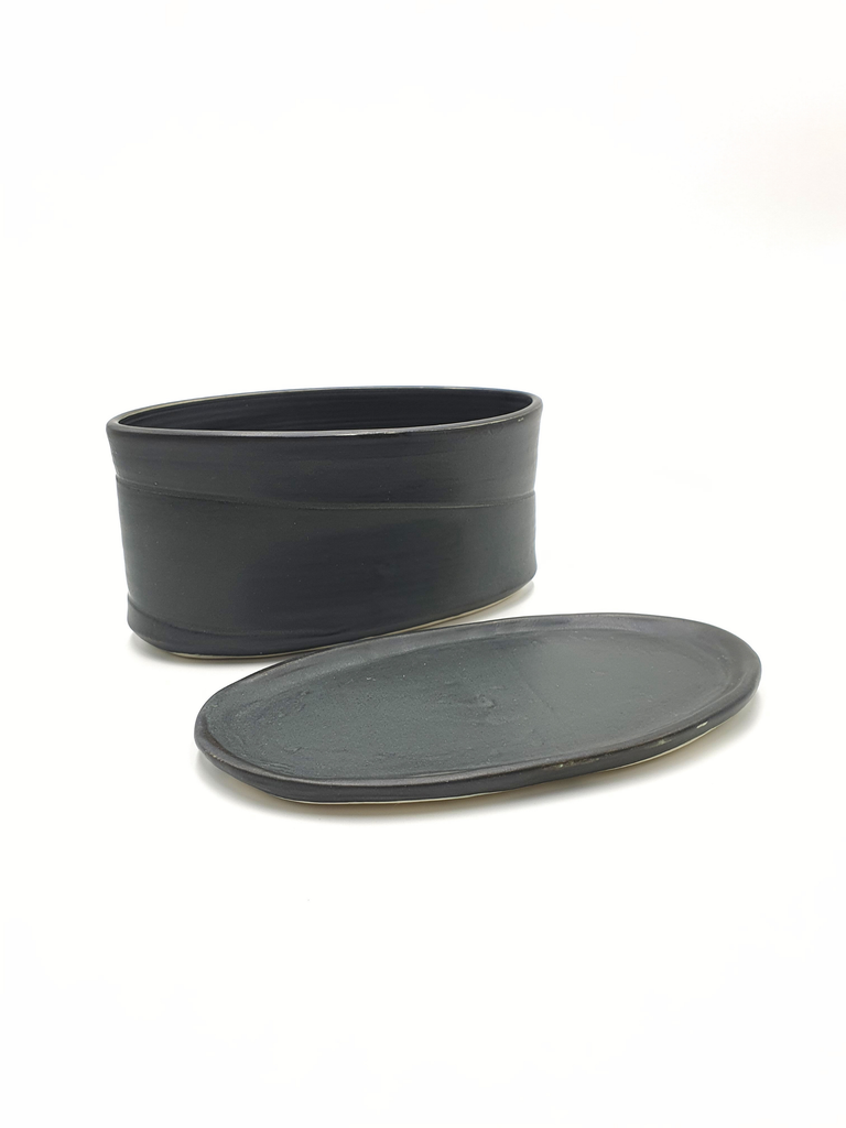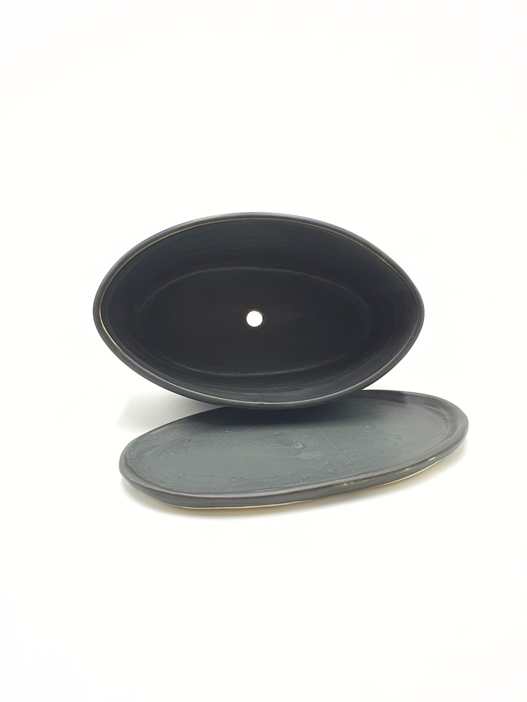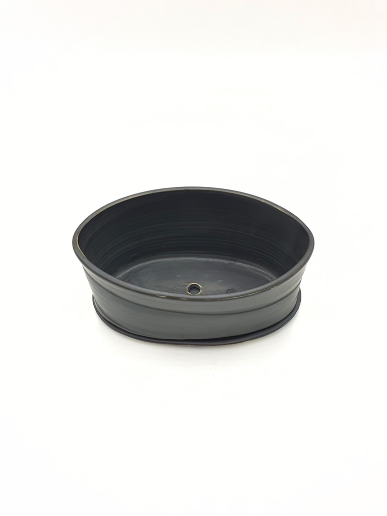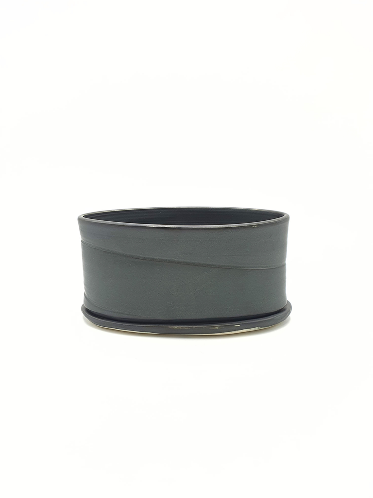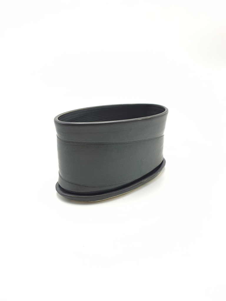 Hand built plant pot and matching plate, decorated in soft black satin glass.