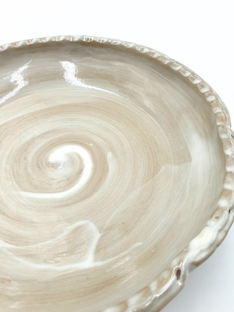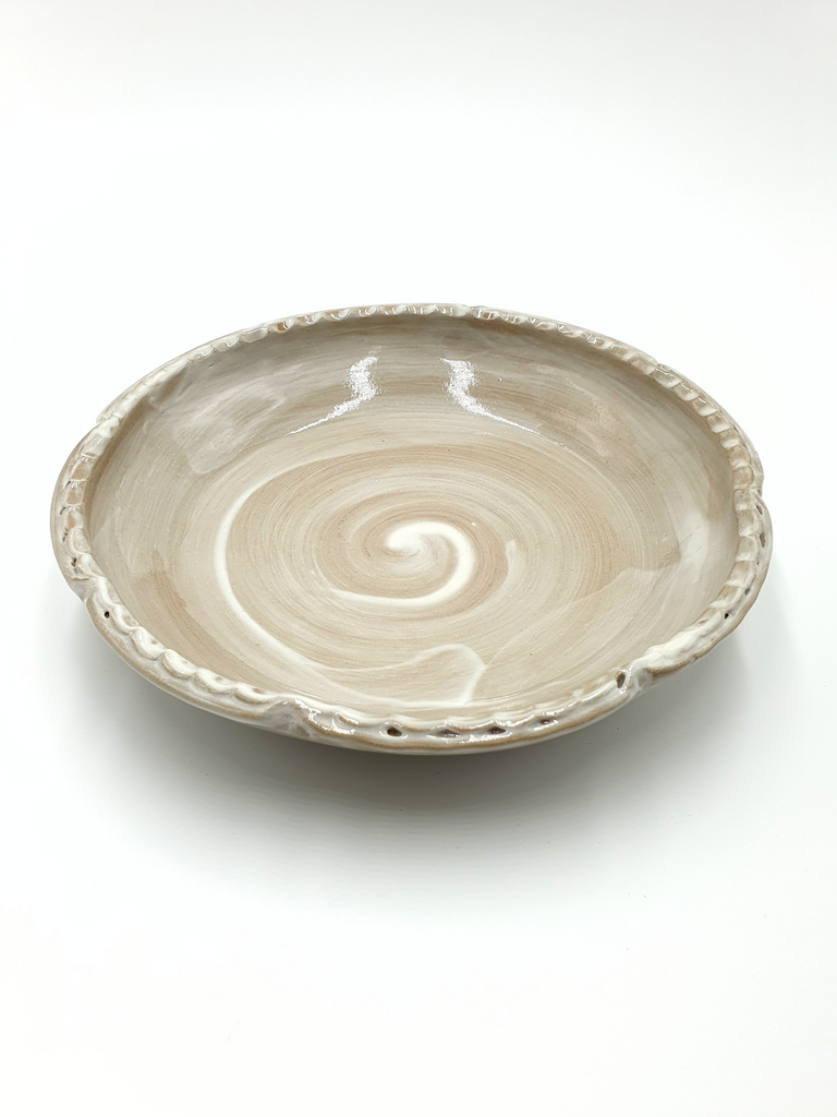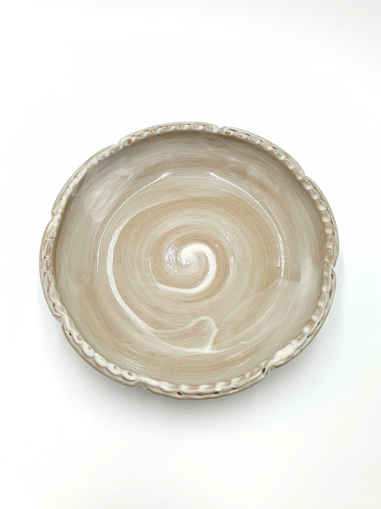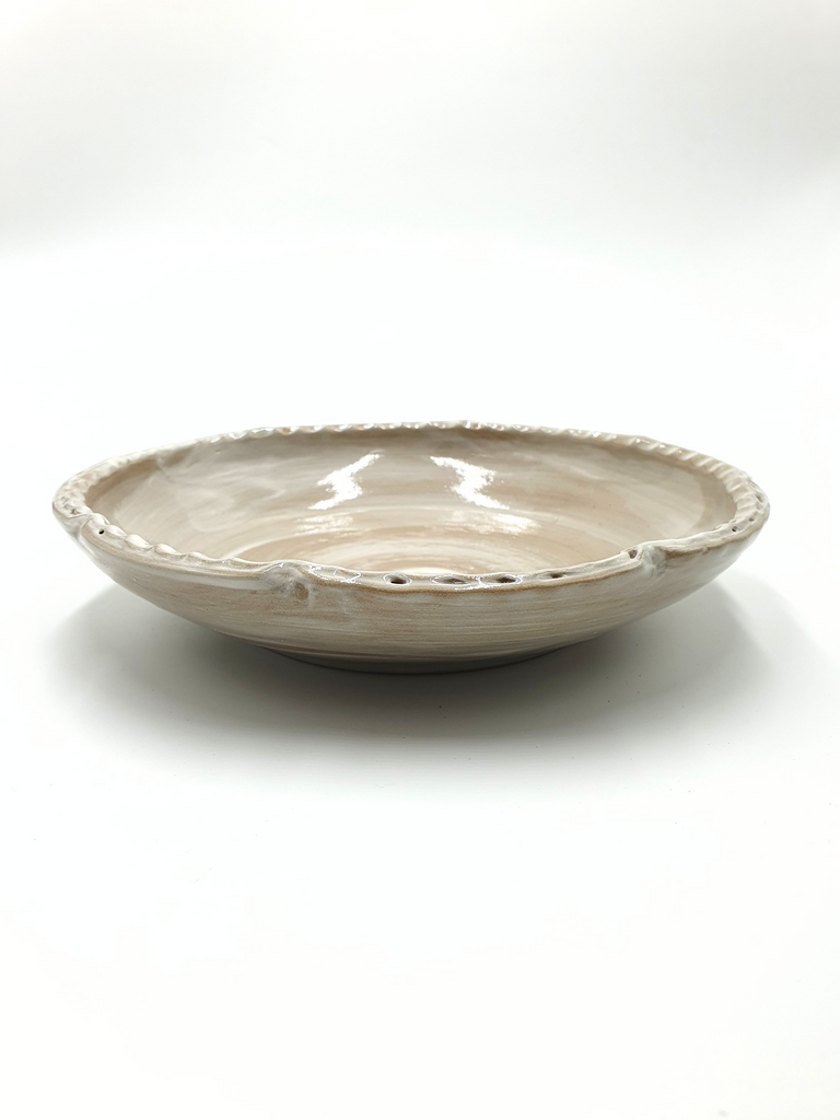 Scalloped hand thrown stoneware bowl decorated with clear and white gloss glazes. The bowl's edges are hand crimped, bringing joy to the table.
