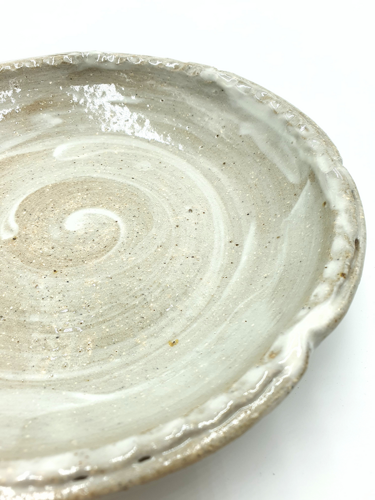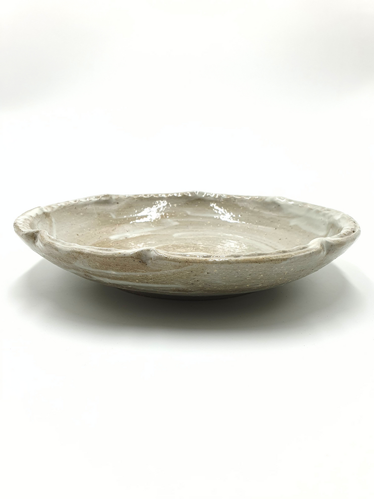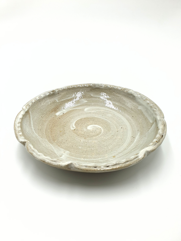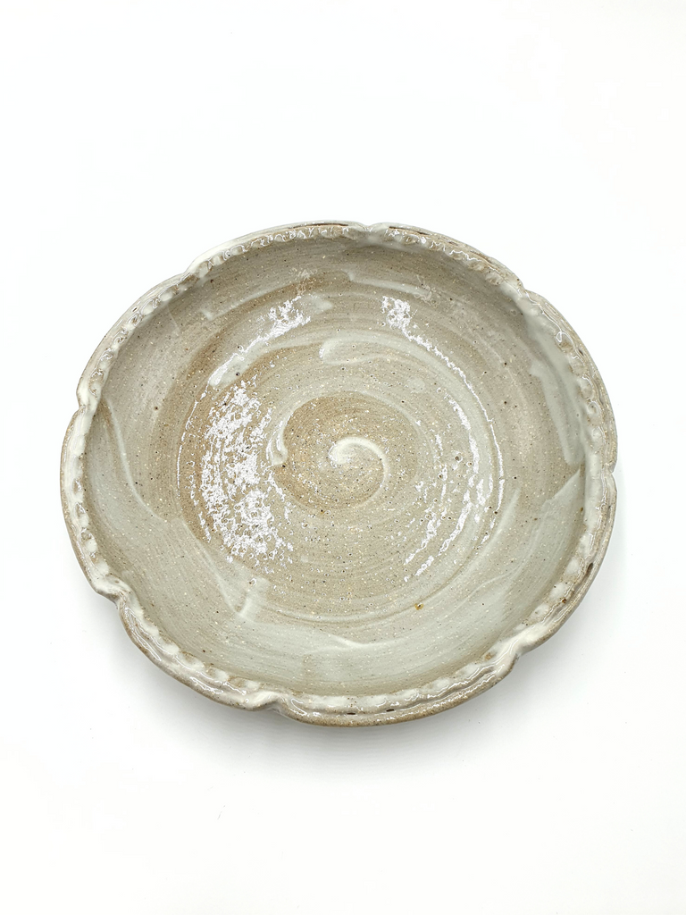 Scalloped hand thrown stoneware bowl decorated with clear and white gloss glazes. The bowl's edges are hand crimped in a speckled textured clay, bringing joy to the table.