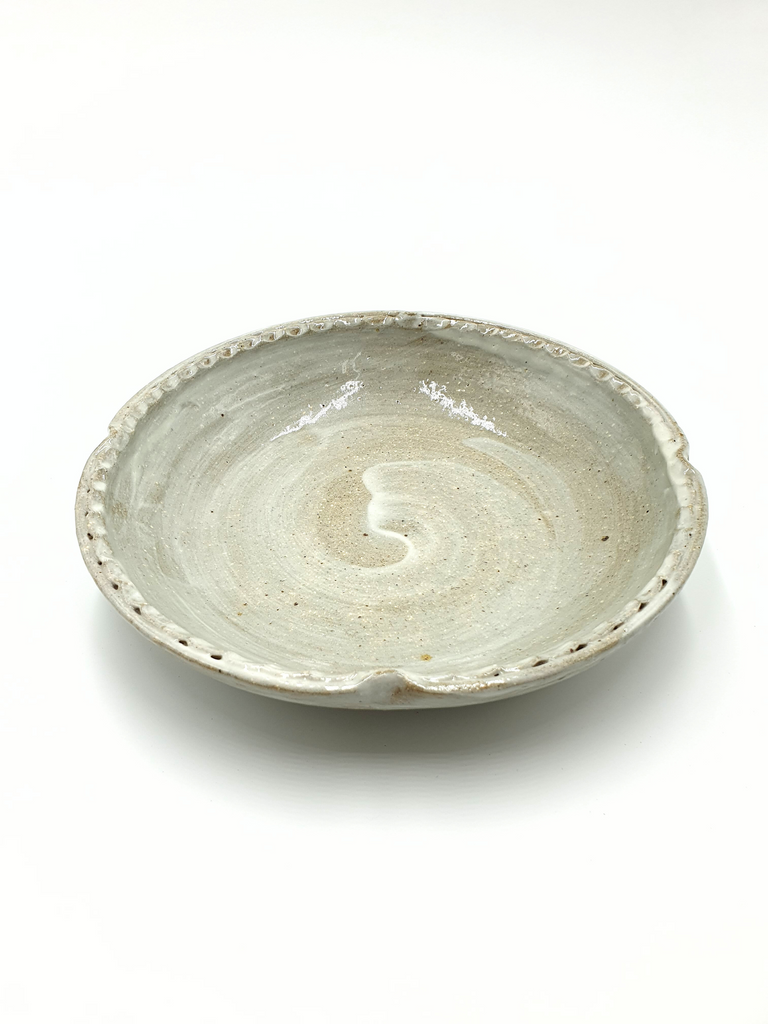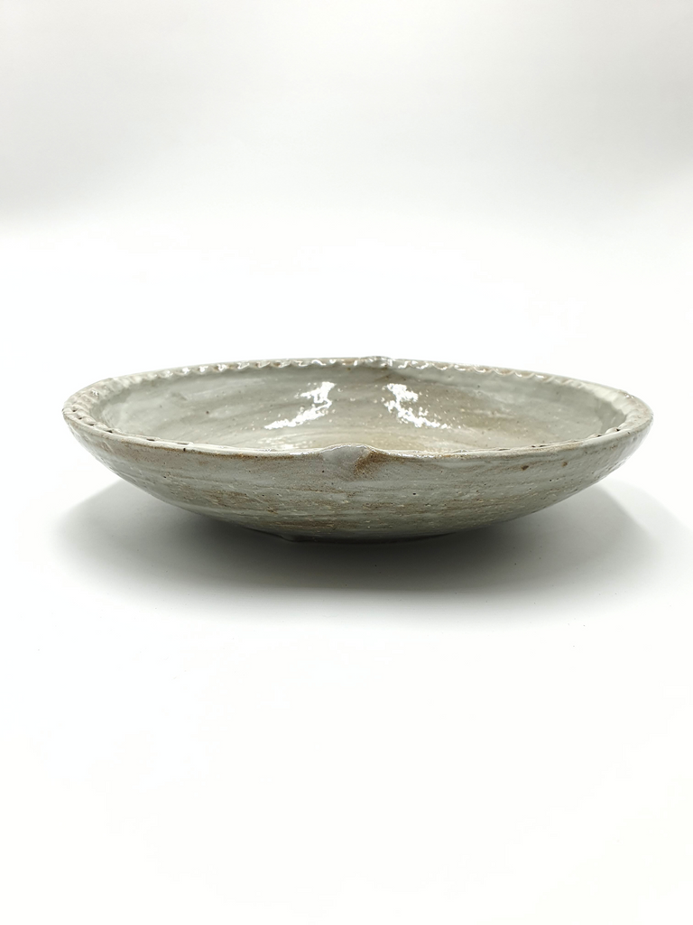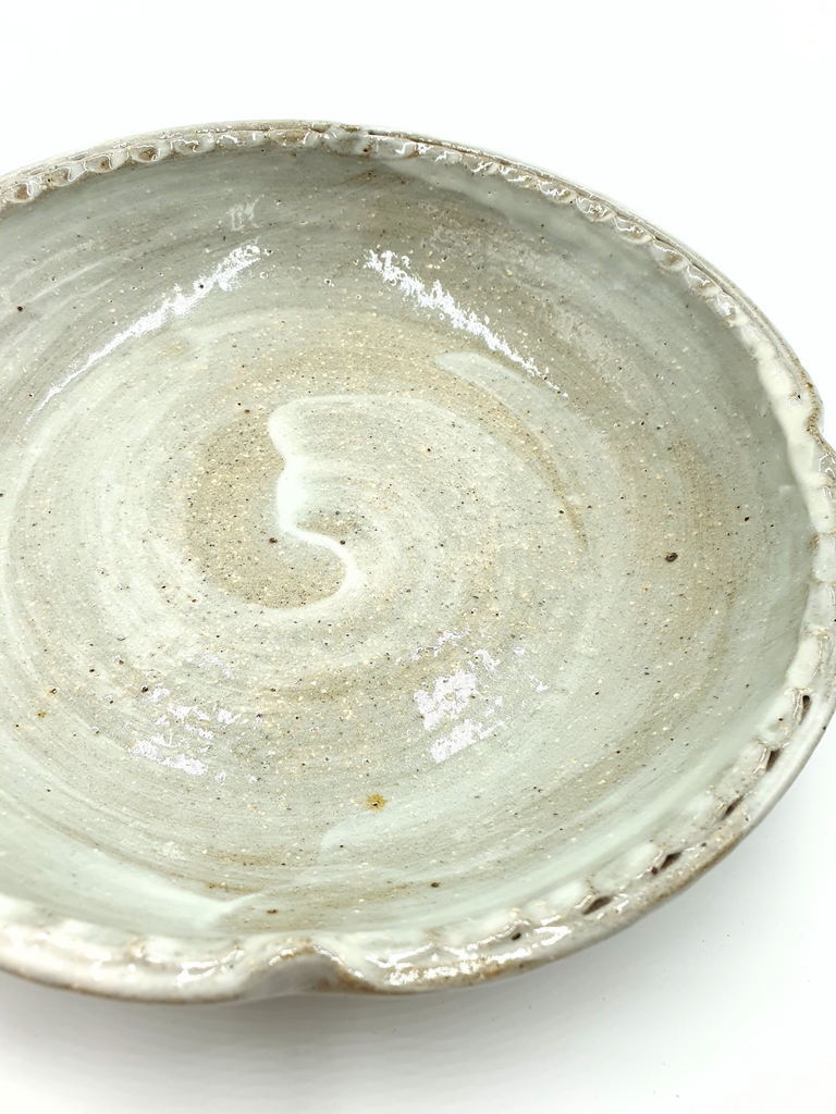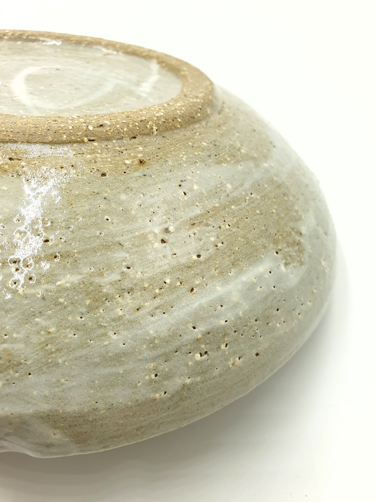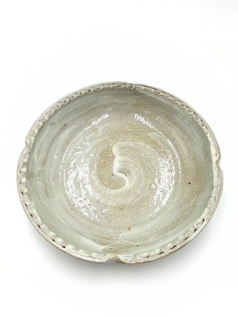 Scalloped hand thrown stoneware bowl decorated with clear and white gloss glazes. The bowl's edges are hand crimped in a speckled textured clay, bringing joy to the table.