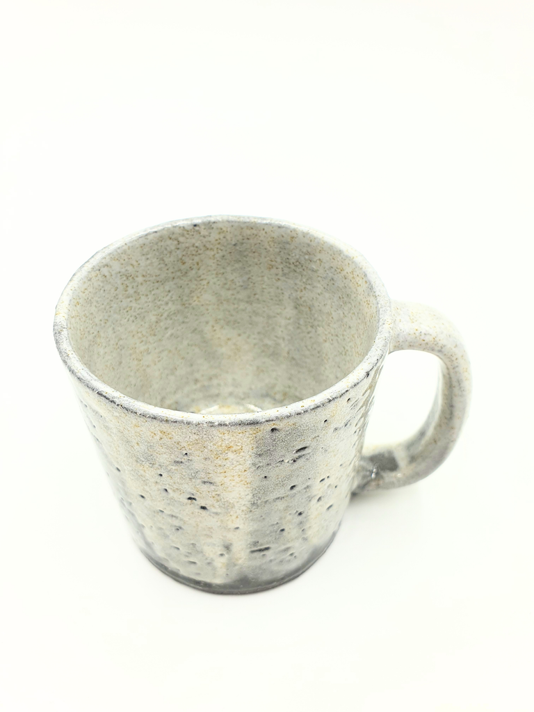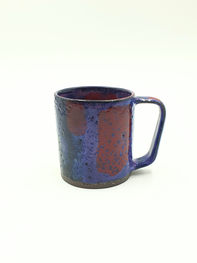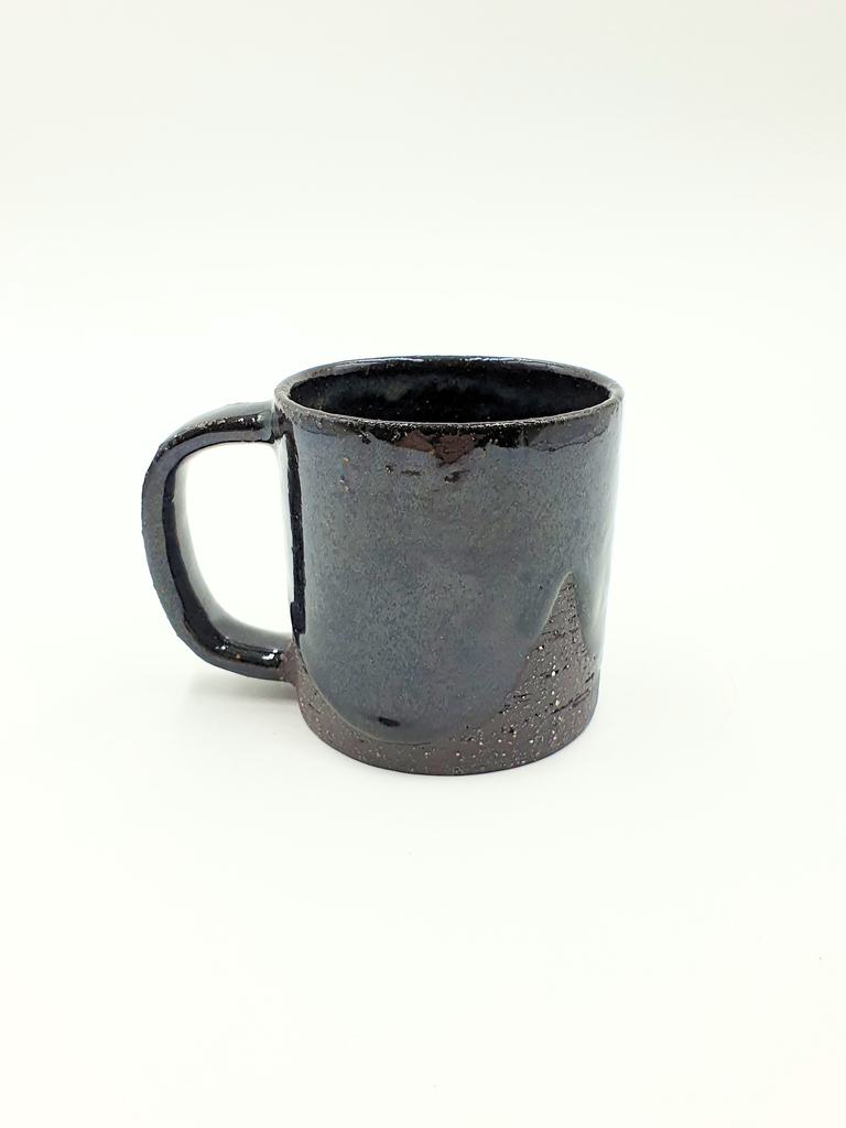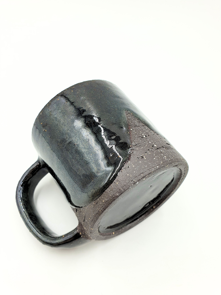 Hand thrown mugs in speckled black clay decorated with a variety of soft gloss glazes.