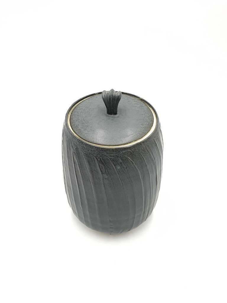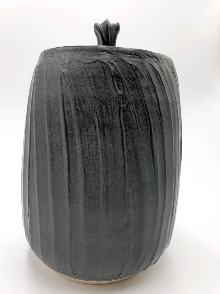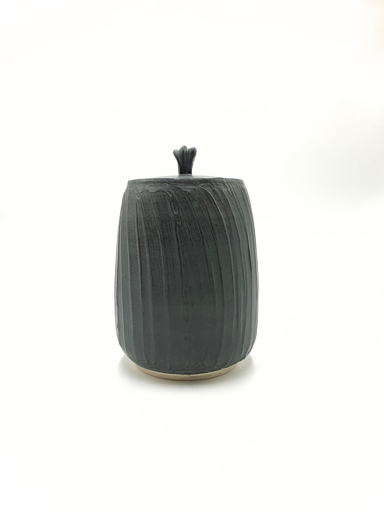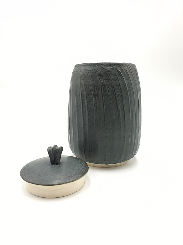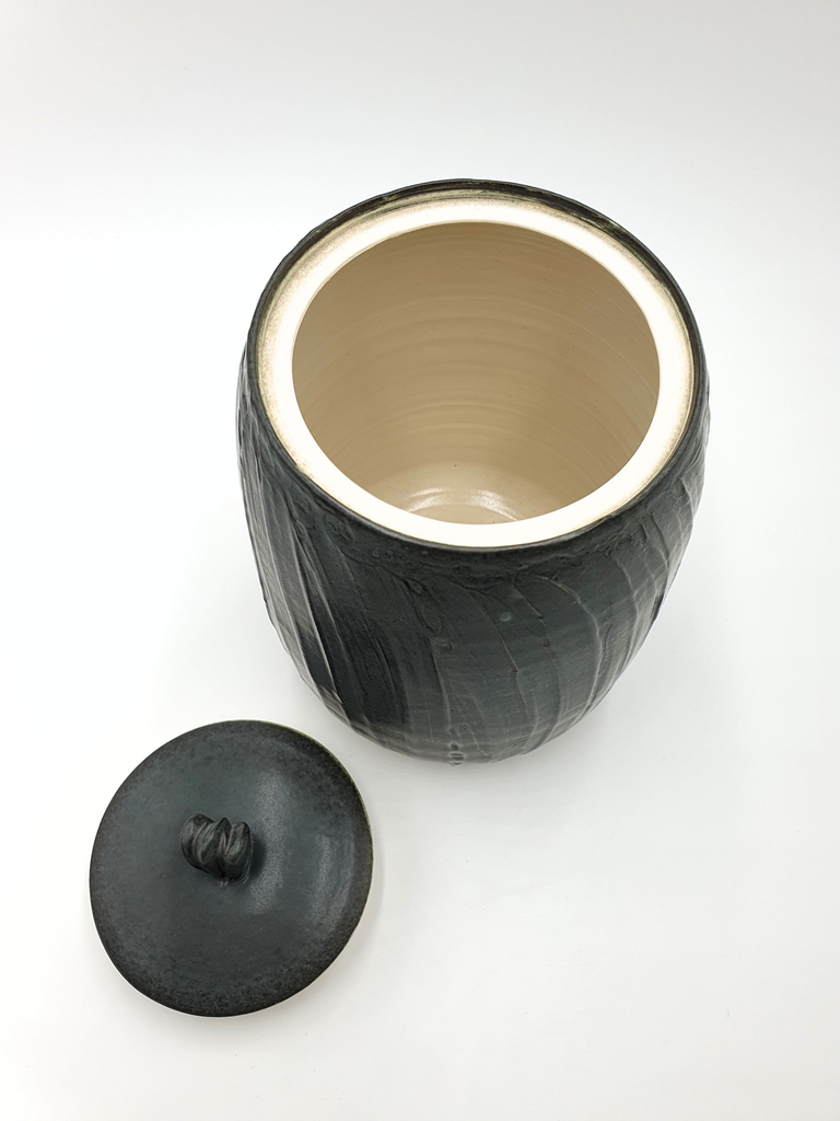 Hand thrown ceramic lidded jar in soft satin black glaze.