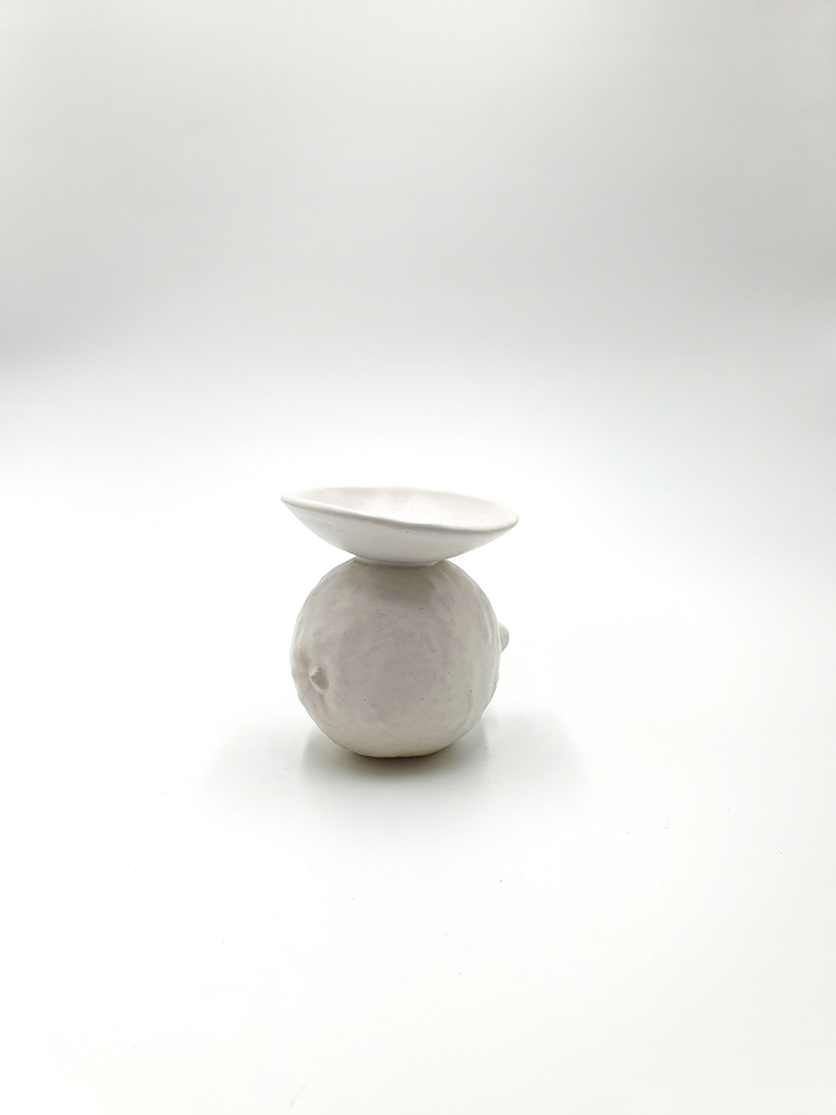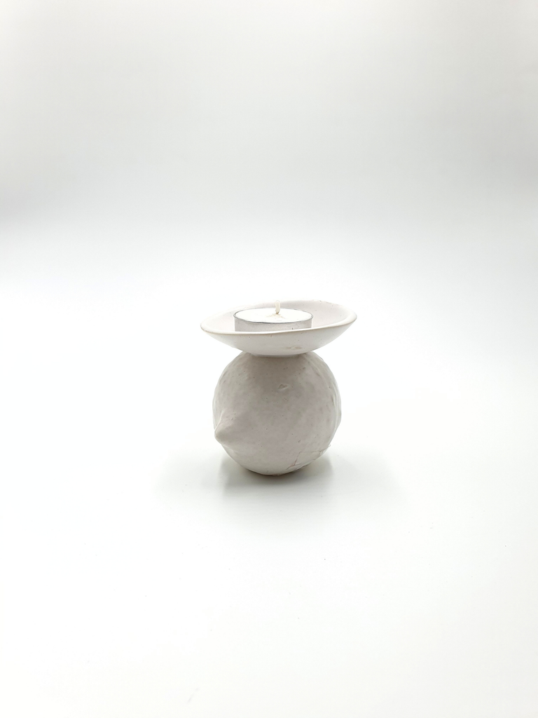 Elegant lemon tealight holder. The vessel is cast from moulds of real fruit, and finished with a soft satin white glaze.