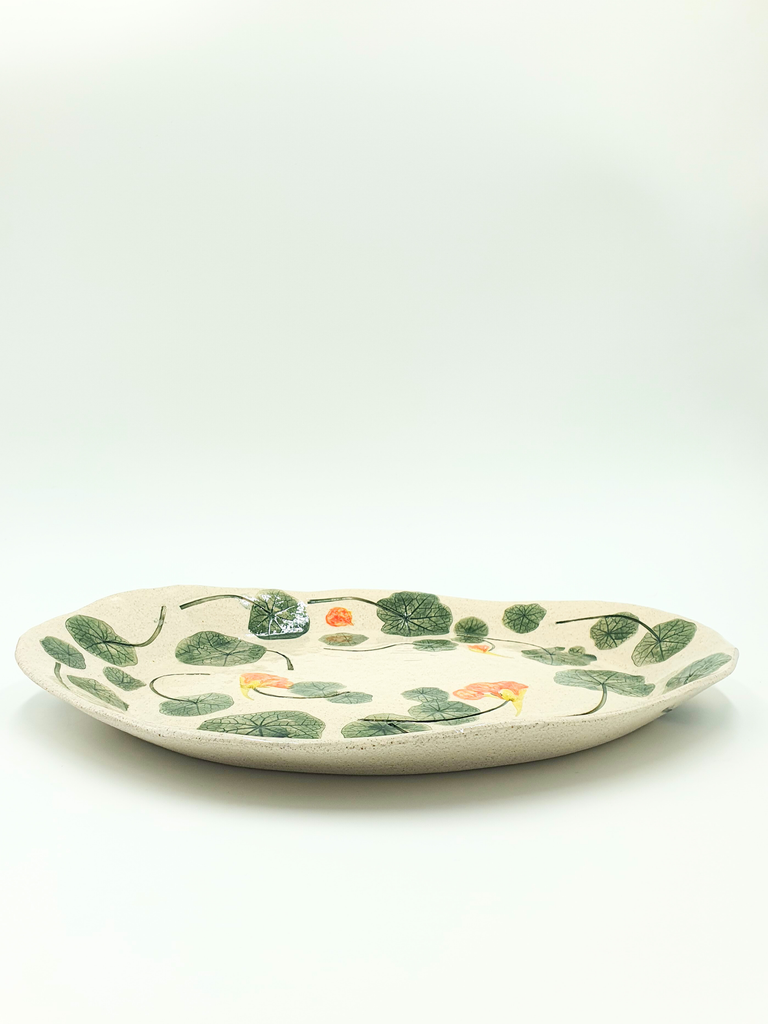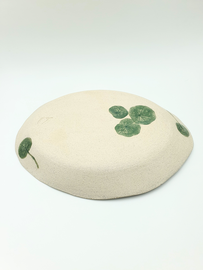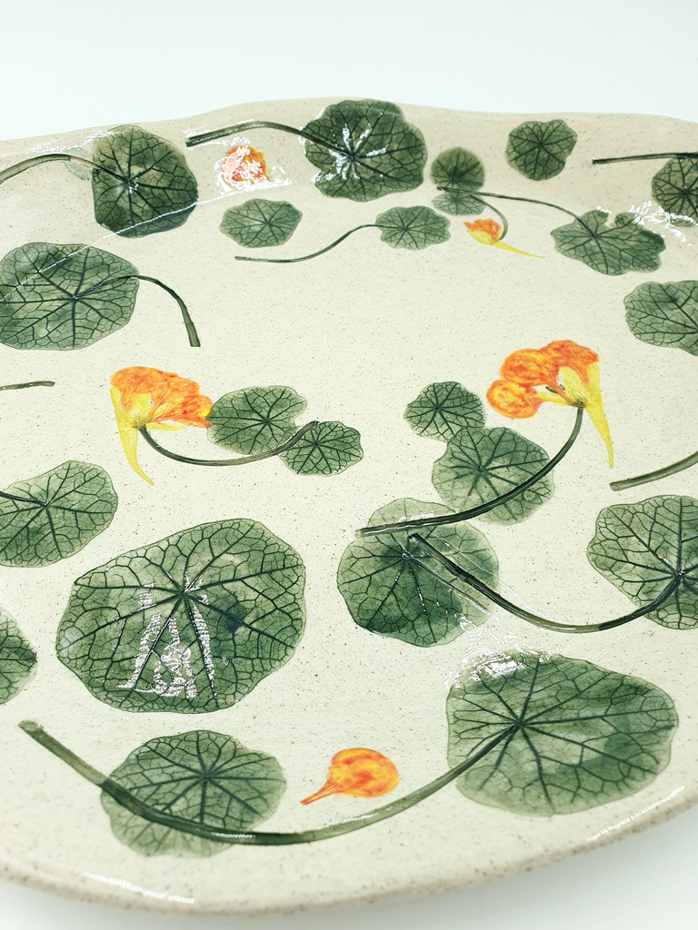 Natasha uses real leaves, flowers and herbs collected from her garden to imprint in the clay, and decorate with watercolour style underglaze.