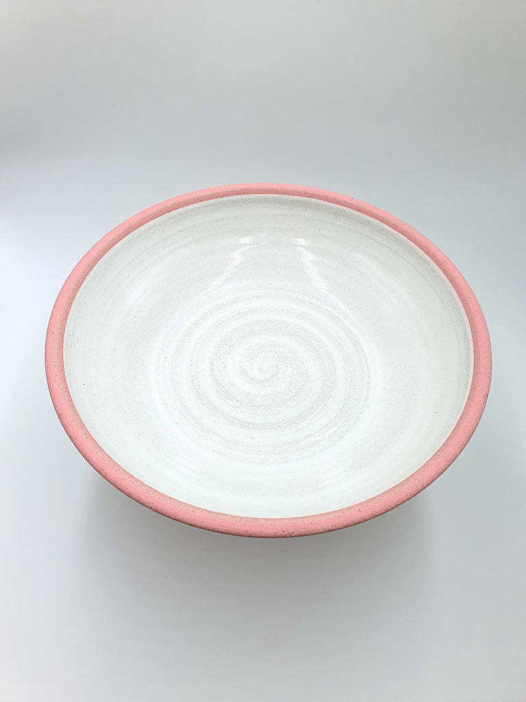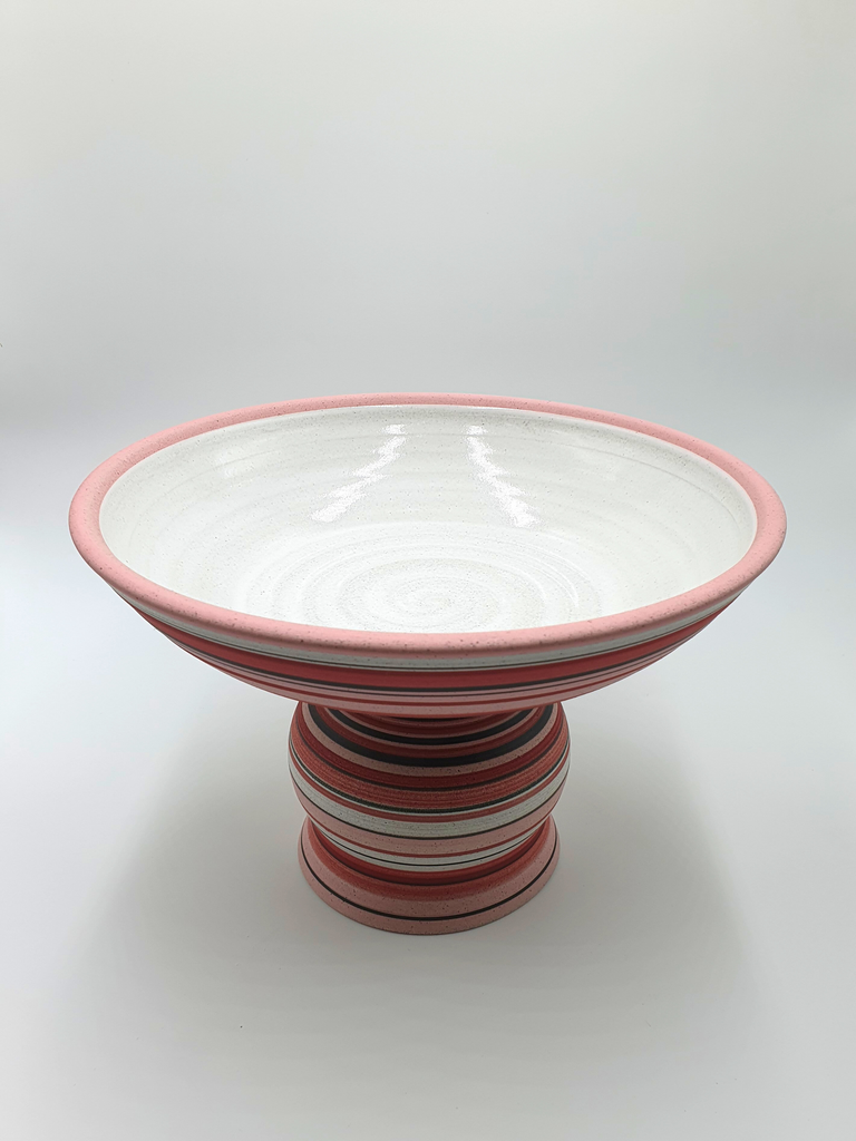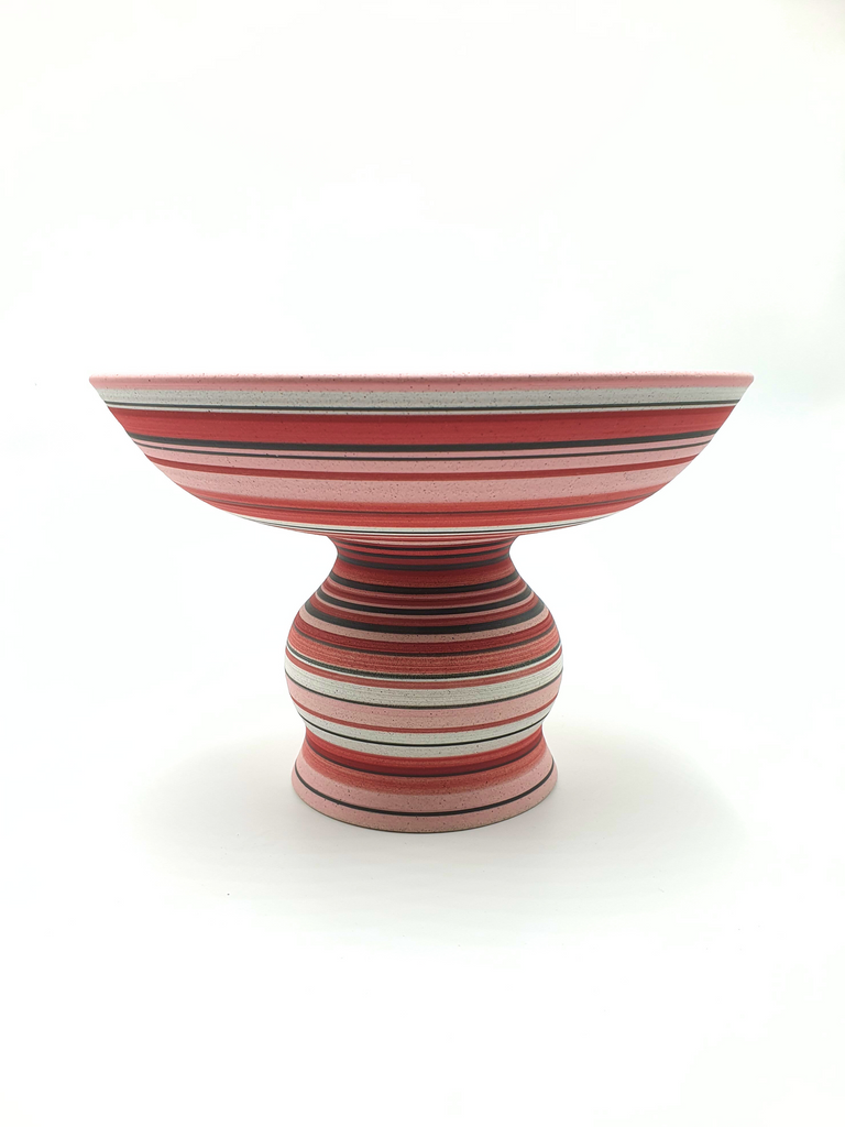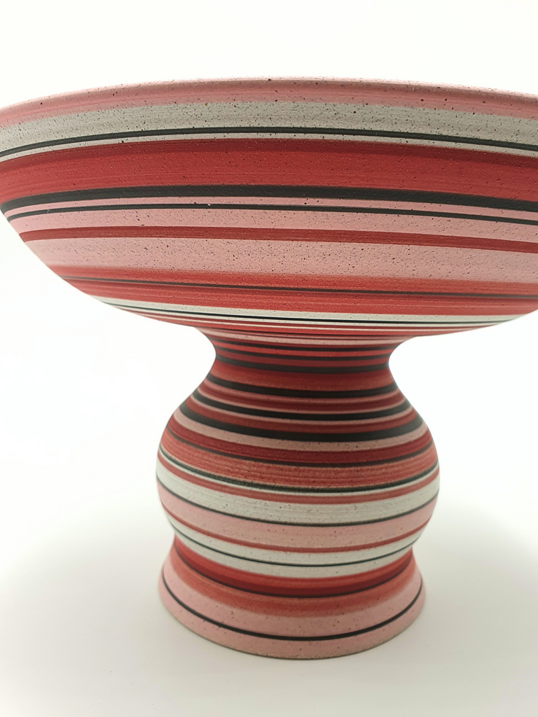 Red striped voluptuous fruit bowl. Gillian uses the traditional technique of terra sigillata and a combination of gas and electric firing to create the unique colours and textures.