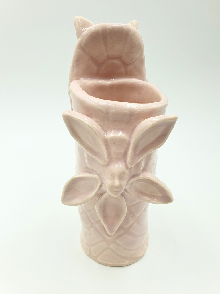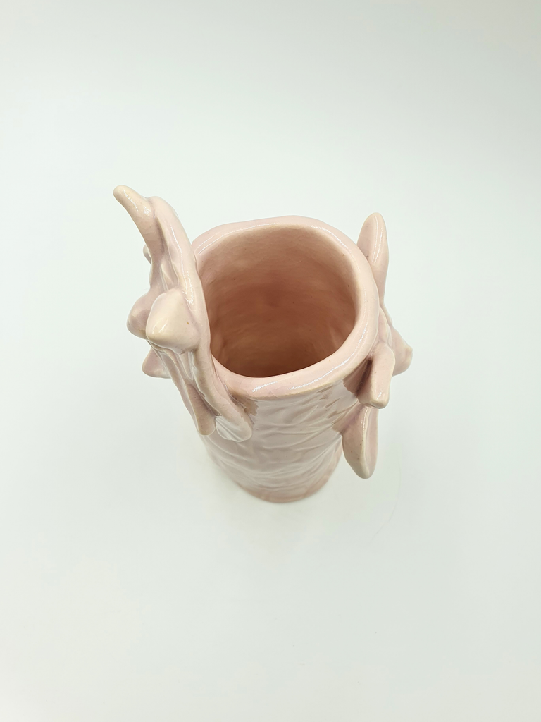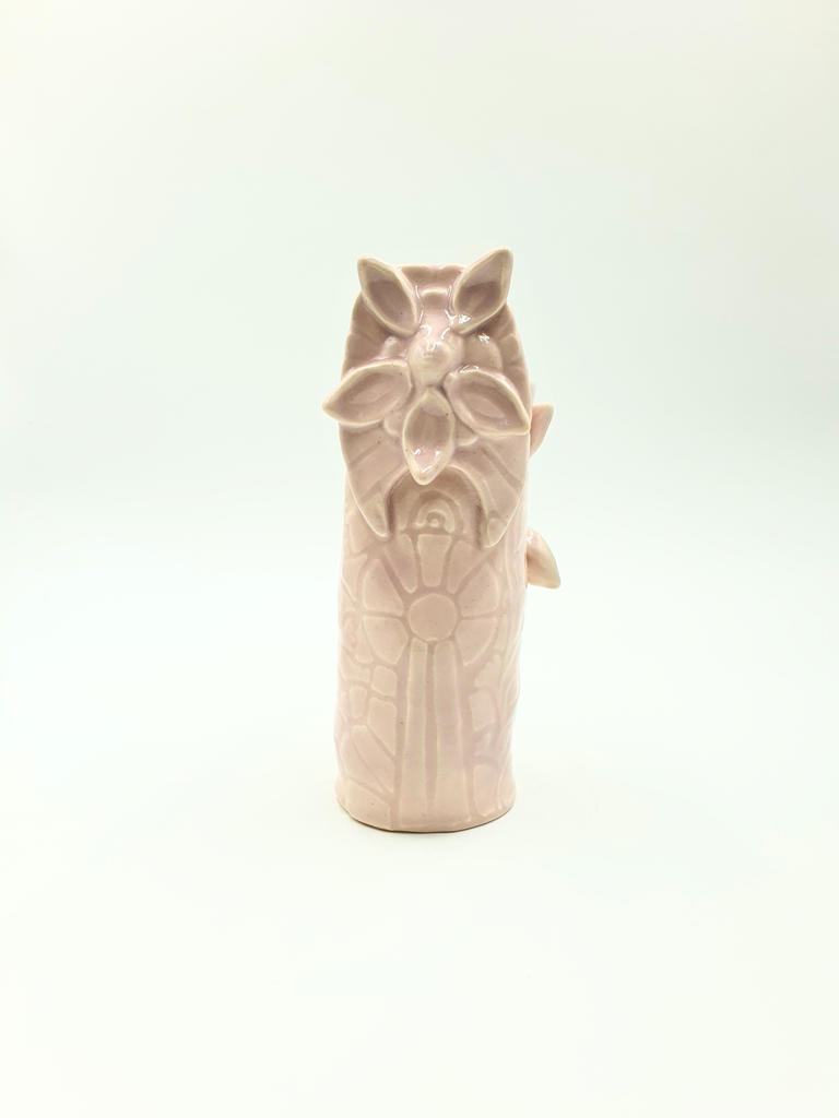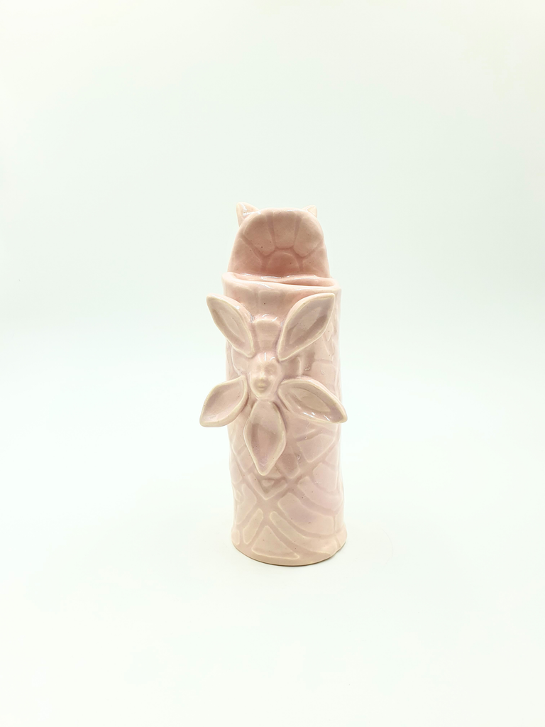Porcelain hand-sculpted vase decorated in lilac crackle glaze.