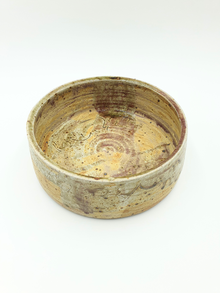 Conical serving bowls with apricot matte glaze and sgraffito decoration. Janice decorates all her work in homemade ash glazes, oxides and raw materials before firing at home in a reduction kiln which creates the incredible and unique organic effects.