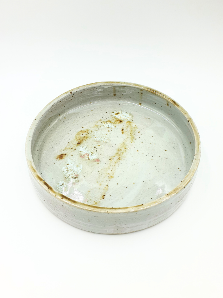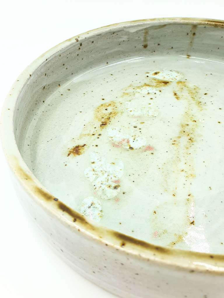 Straight edged conical serving platter. Janice decorates all her work in homemade ash glazes, oxides and raw materials before firing at home in a reduction kiln which creates the incredible and unique organic effects.