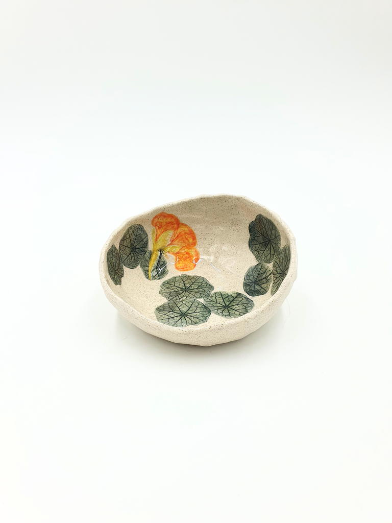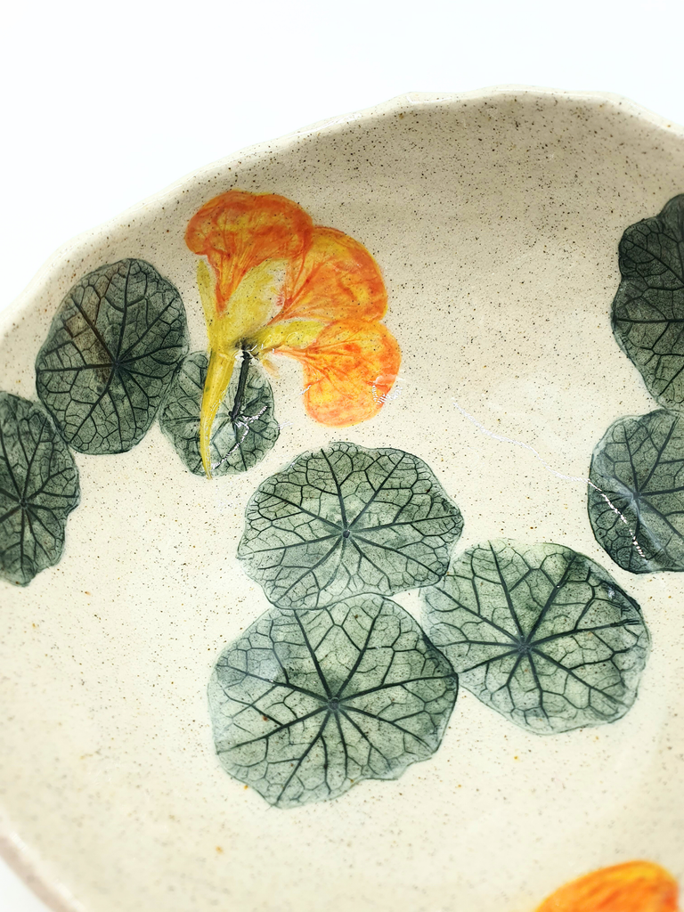 Natasha uses real leaves, flowers and herbs collected from her garden to imprint in the clay, and decorate with watercolour style underglaze.