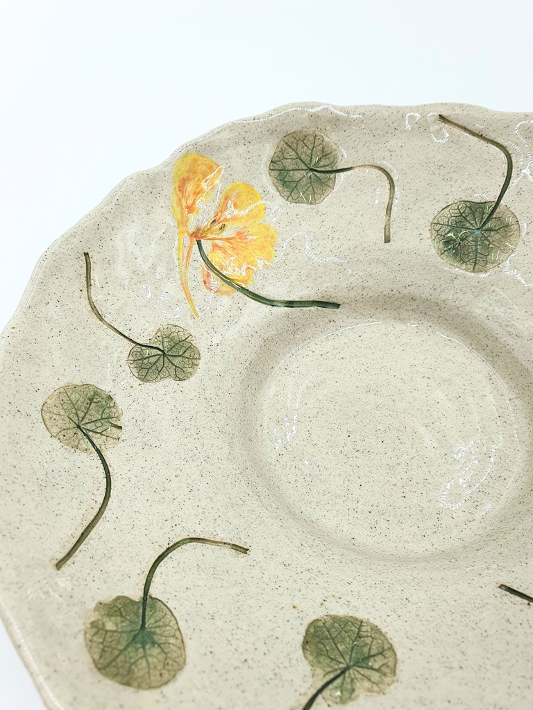 Natasha uses real leaves, flowers and herbs collected from her garden to imprint in the clay, and decorate with watercolour style underglaze.