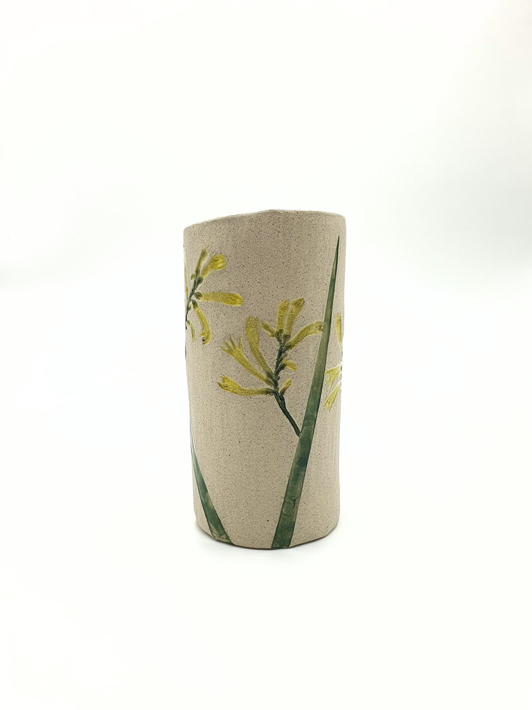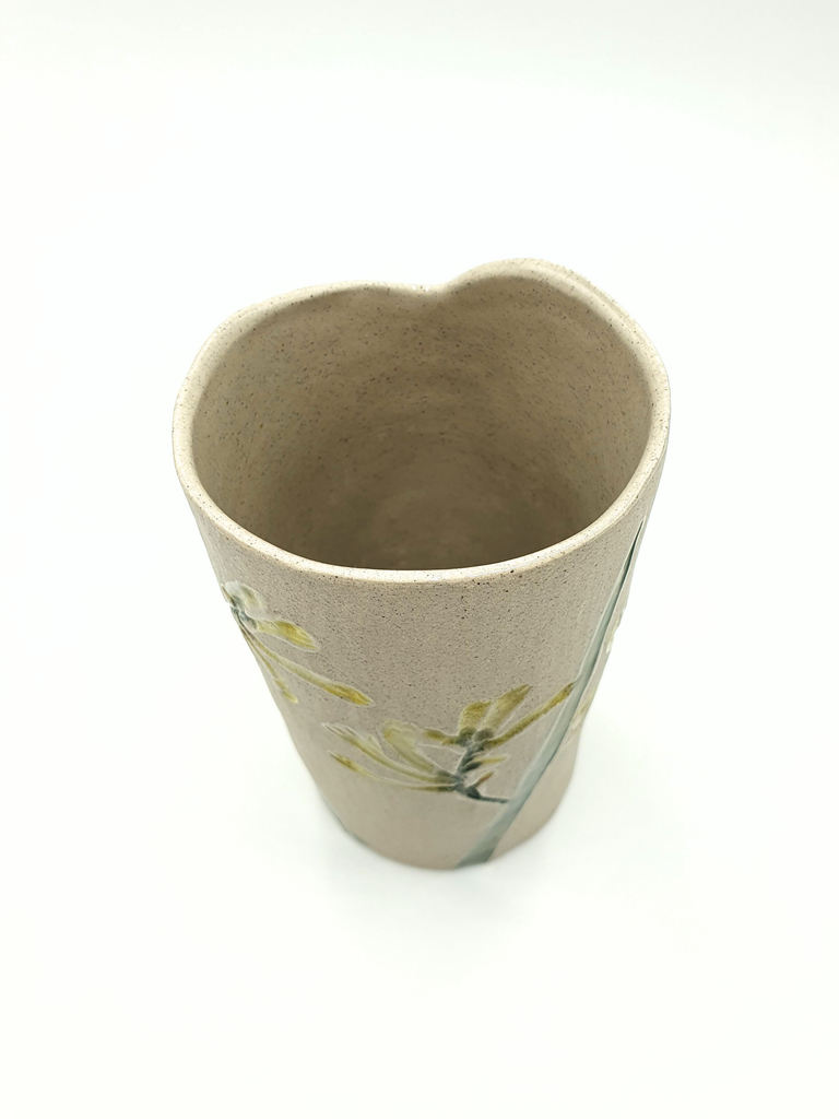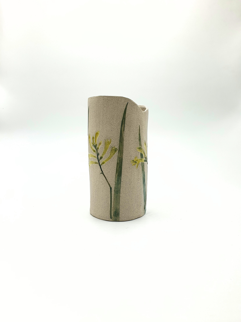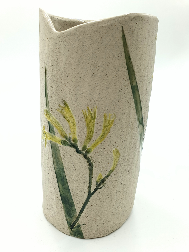Hand built vase made from delightfully speckled grey clay with clear gloss glaze illuminating the botanicals.