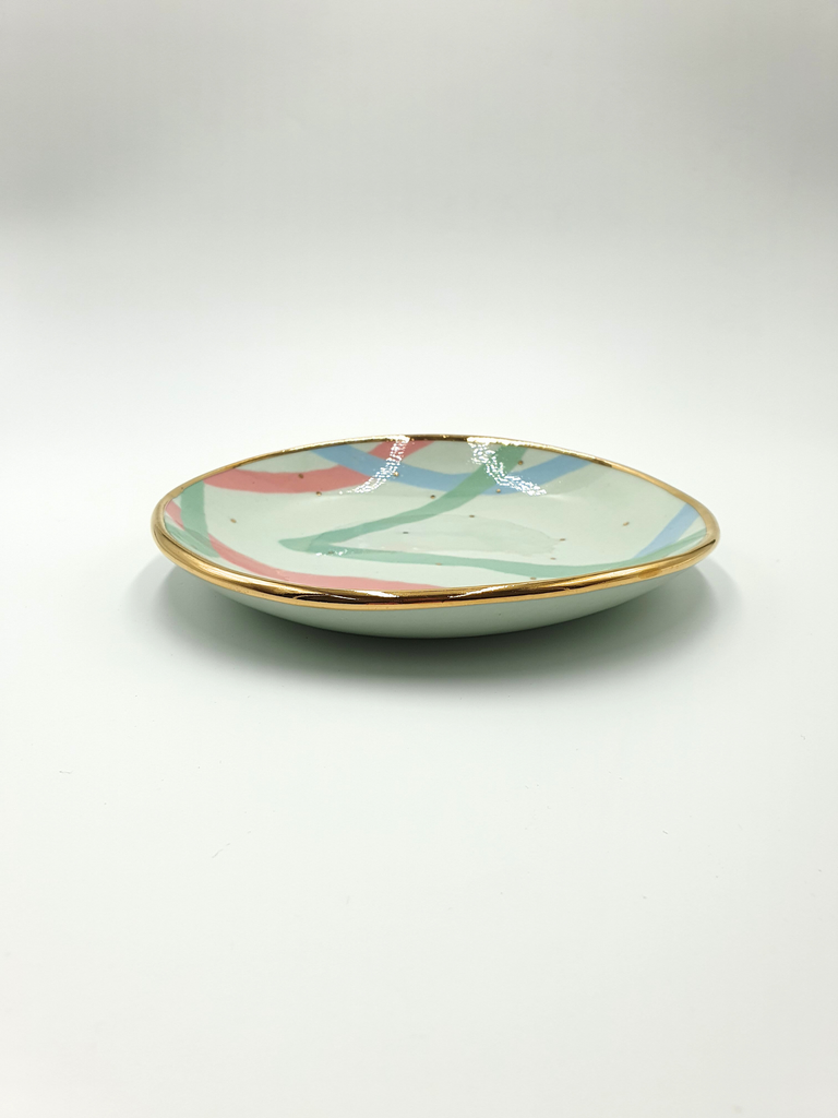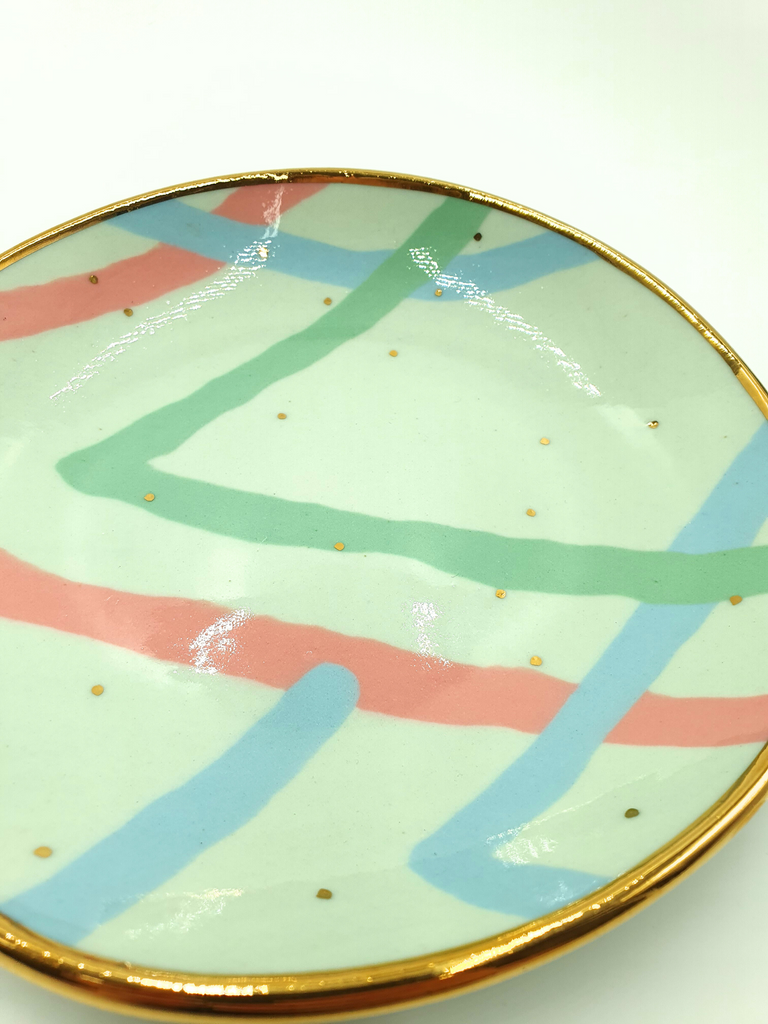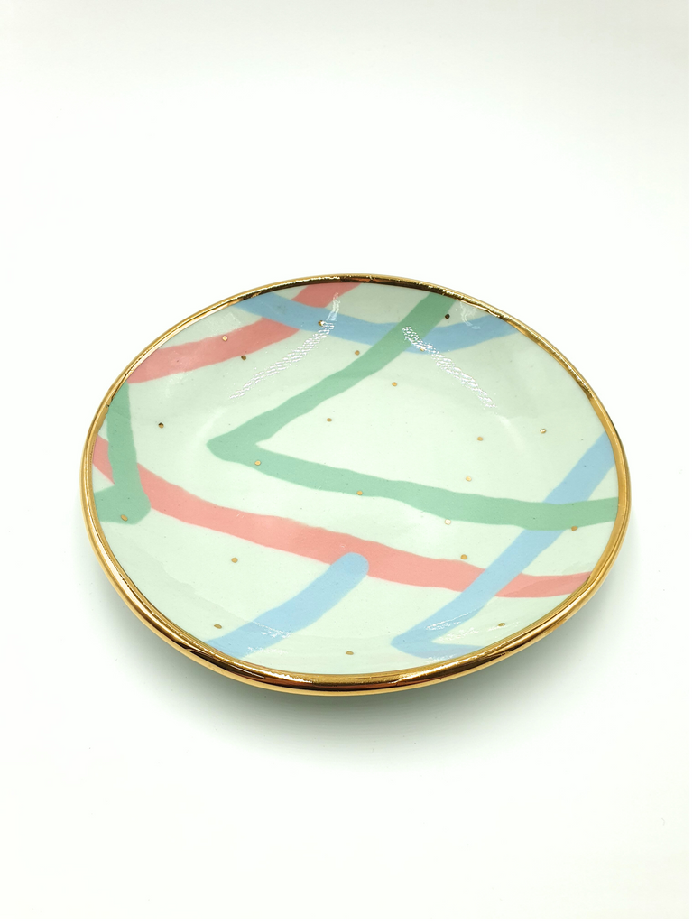 Handbuilt porcelain bowl decorated with gold lustre. Ruby Pilven's work is made from pure porcelain and decorated in a contemporary take on nerikomi style using coloured stains.